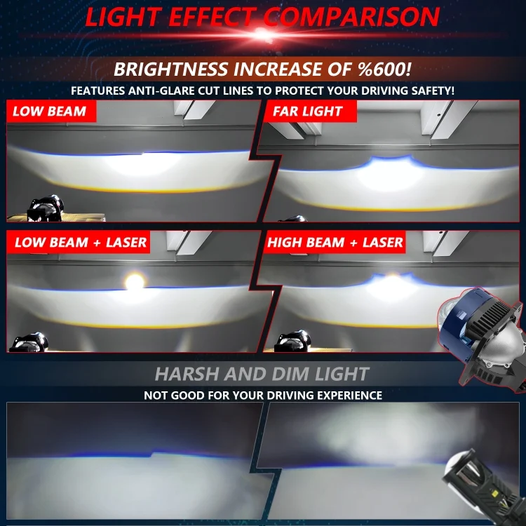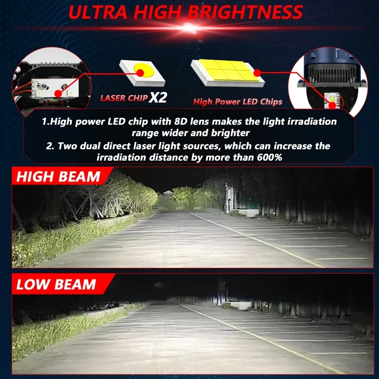 2. Adopts a high-power LED light source + dual laser light source combination, with anti-glare cutting line and ultra-long-distance laser lighting functions.