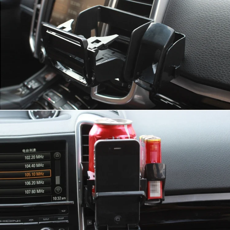 7. The rear side of the cup holder is fixed to the air outlet through two link rods inserted into the air outlet. There is a small tongue at the bottom of the cup holder, which can be used to withstand the air outlet, thus forming a three-point fixed posture for the cup holder