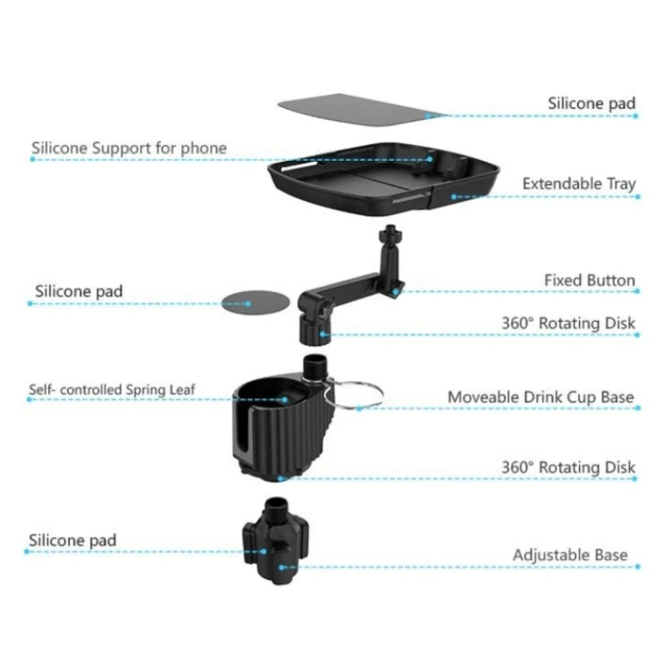 2.Adjustable Design:The tray of Cup Holder Tray for Car can be rotated 360 degrees. The stand has extended arms that allow for wider depth and longer lengths.