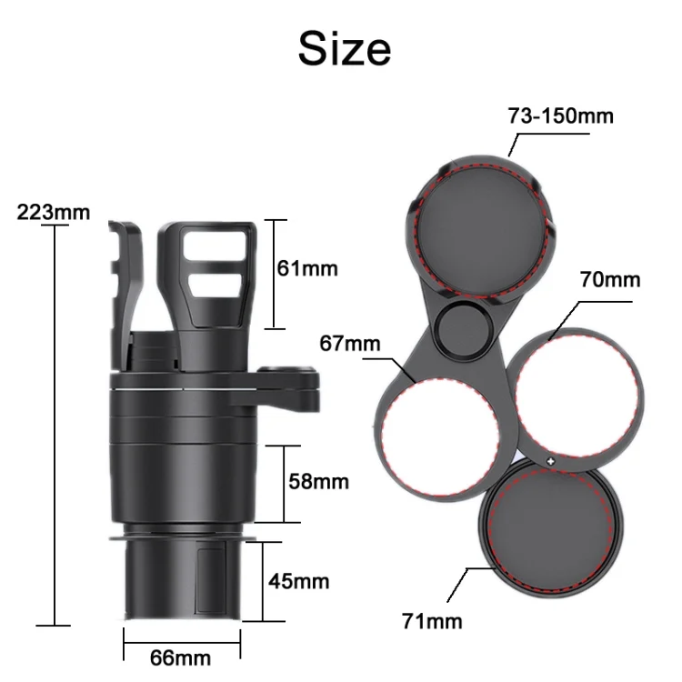 2. The diameter of the upper cup holder can be telescopically adjusted, and the adjustment range is 73-150 mm to meet more storage needs
