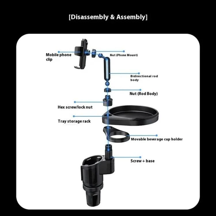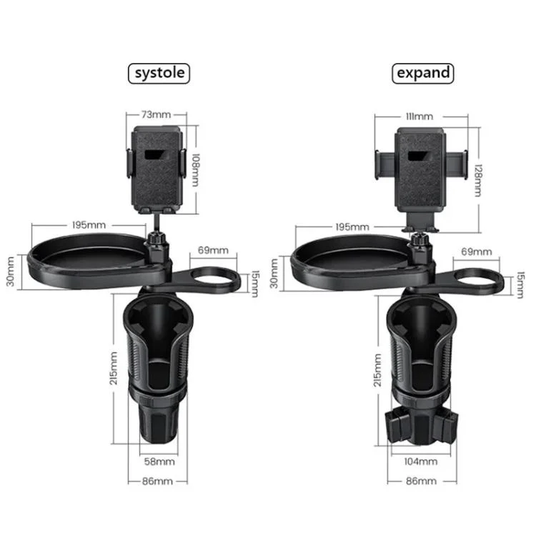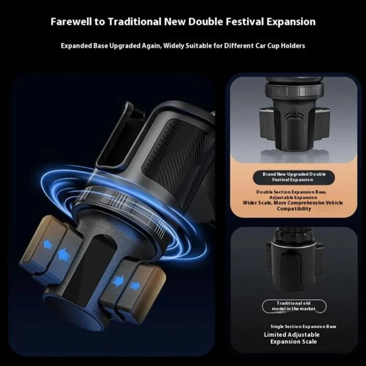 1.4-in-1 Multifunctional Design:This car cup holder expander combines a phone mount, tray holder, detachable cup holder, and cup compartment, offering a versatile solution for your travel needs.