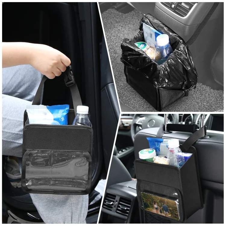 2. Multipurpose Design: This item not only be used as a trash can, but also can be used as a storage bag. Transparent PVC front pocket, you can place your mobile phone horizontally to watch video, release hands.