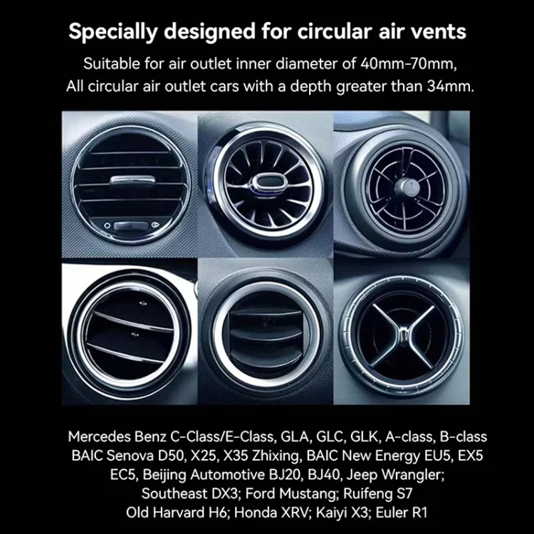 1. Specialized Circular Vent Mount: Adjustable clamp fits circular air vents with inner diameters of 40mm-70mm and depths greater than 34mm, ensuring wide vehicle compatibility