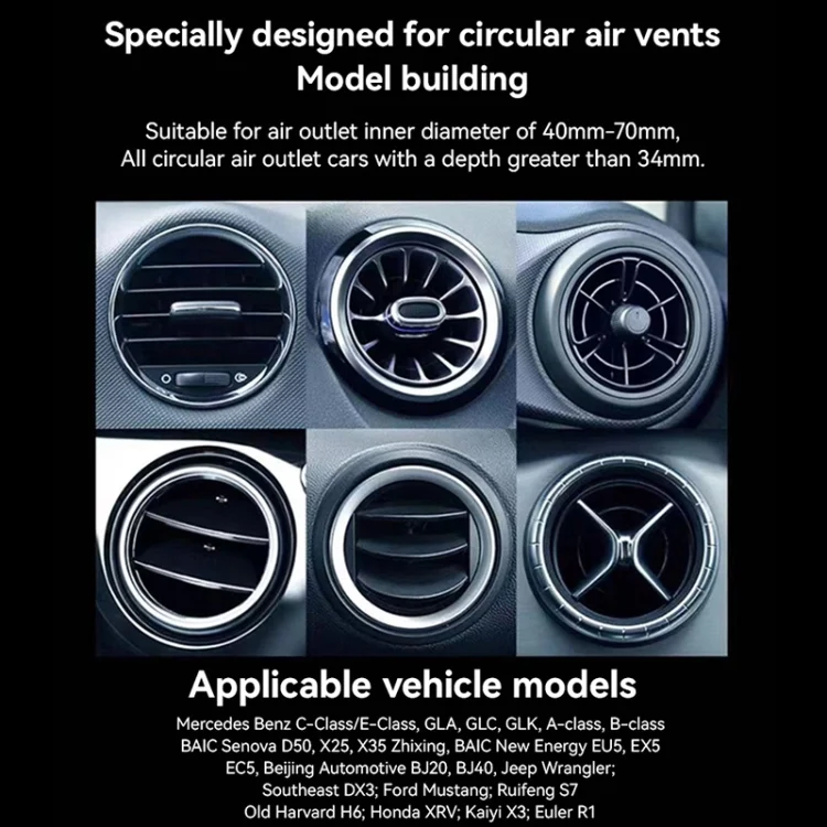 1. Special circular air vent bracket: The adjustable clamp is suitable for inner diameters of 40mm-70mm And the round vents with a depth greater than 34mm ensure wide vehicle compatibility