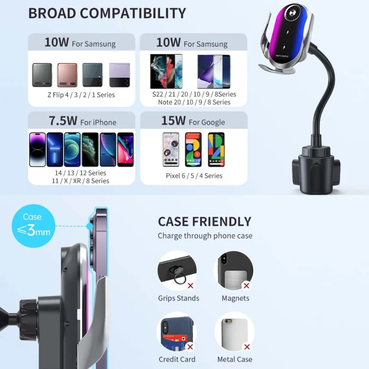 Double Coil Car Wireless Charger Water Cup Holder For Apple14 / 13 / Samsung ZFLIP4 Series