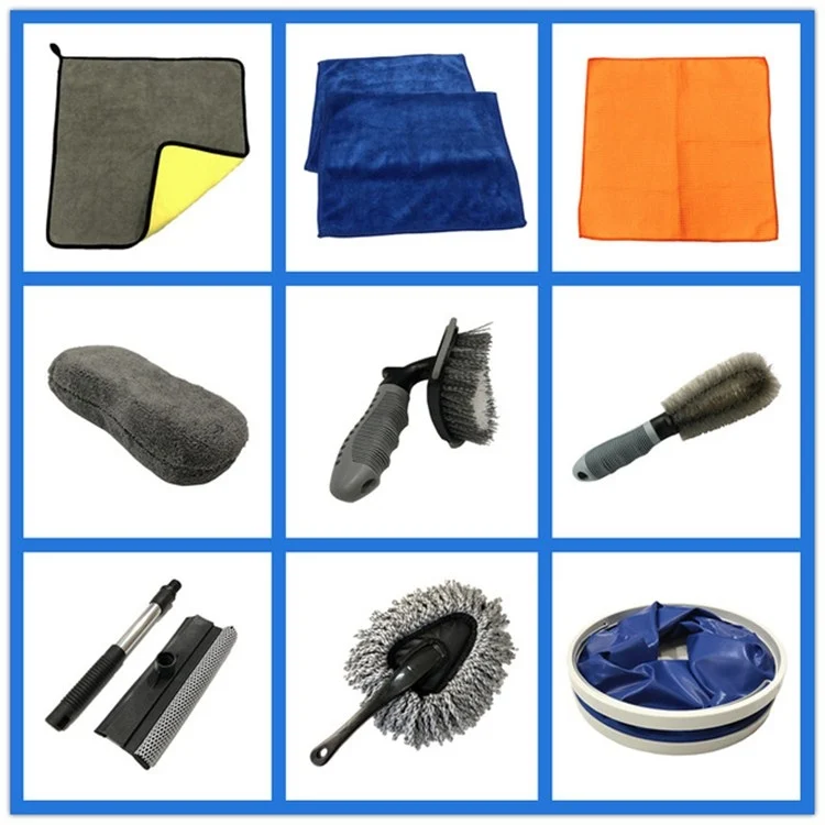 1. Clean ten-piece set: coral velvet towel + microfiber towel + waffle towel + 8-shaped sponge block + T-shaped tire brush + hub brush + small wax mop + glass scraper + folding bucket 11L + storage bag, total 10 Product composition.