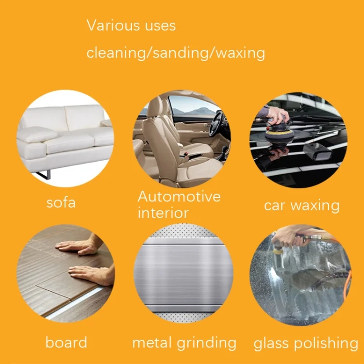 7. Scope of application: sofa, car interior, car waxing, wood board, metal grinding, glass polishing