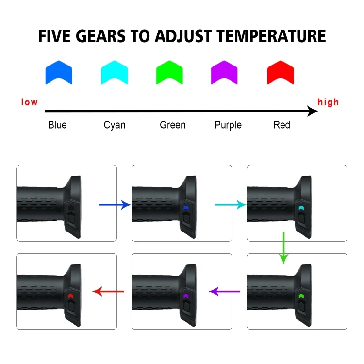 3. In the standby state, press the button on the grip cover. If the power supply voltage is higher than the electric heating start voltage at this time, the system will enter rapid heating, so that the grip cover will heat up quickly, and after a period of time, it will enter smooth heating.