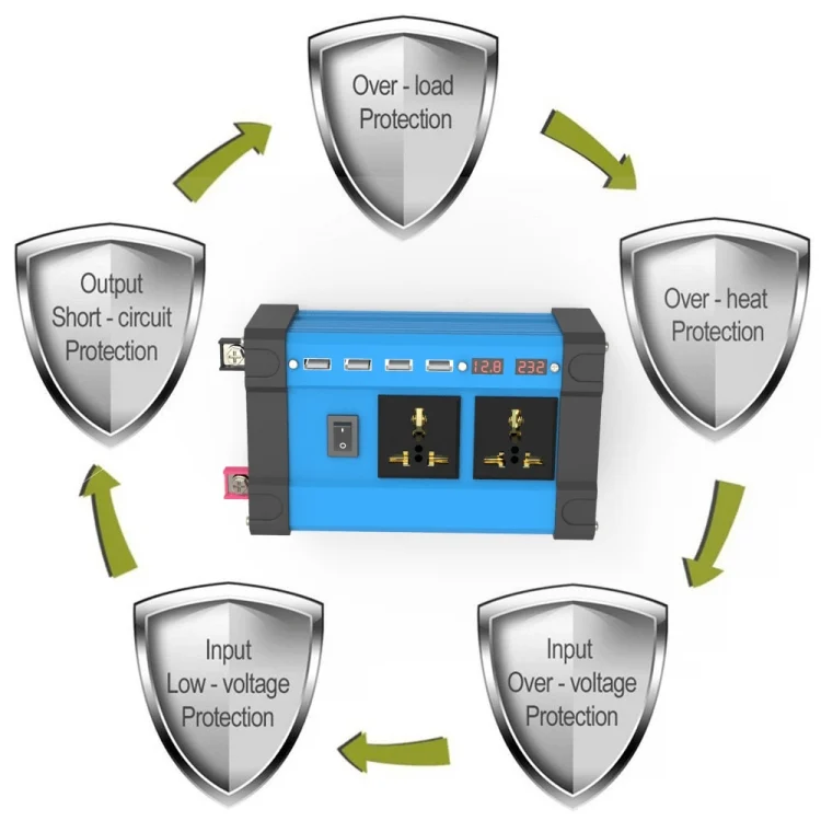 11. Protection functions: overload, over-temperature, high voltage, low voltage, reverse connection, short circuit