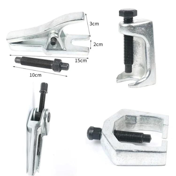 6. Contains: two-jaw tie rod ball head puller: 1100 grams, top pressure height 10 cm, opening range 0-13 cm; large steering arm ball head puller: 844 grams, top pressure height 11 cm, fixed opening 3.5 cm; small steering arm ball head puller: 454 grams, top pressure height 5.5 cm, fixed opening 2.8 cm; vertical ball head extractor: 457 grams, top pressure height 5 cm, fixed opening 1.9 cm; ball head removal Device: 1264g, 15x3cm, top pressure height 5.5cm, accessory length 10cm