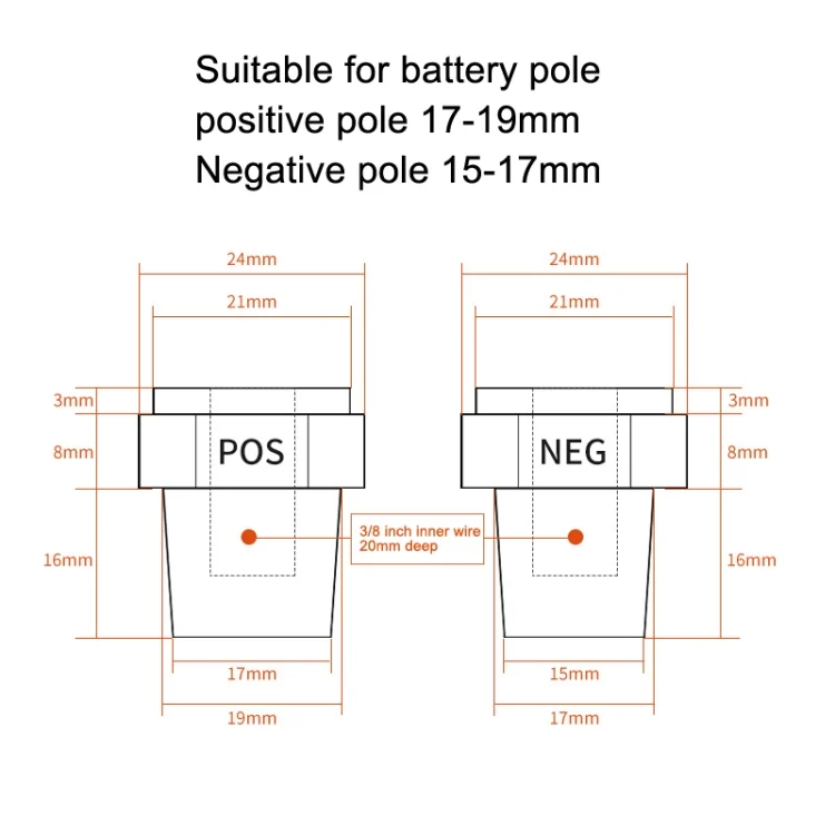 6. Applicable: suitable for large head battery, suitable for battery positive pole 17-19mm, negative pole 15-17mm