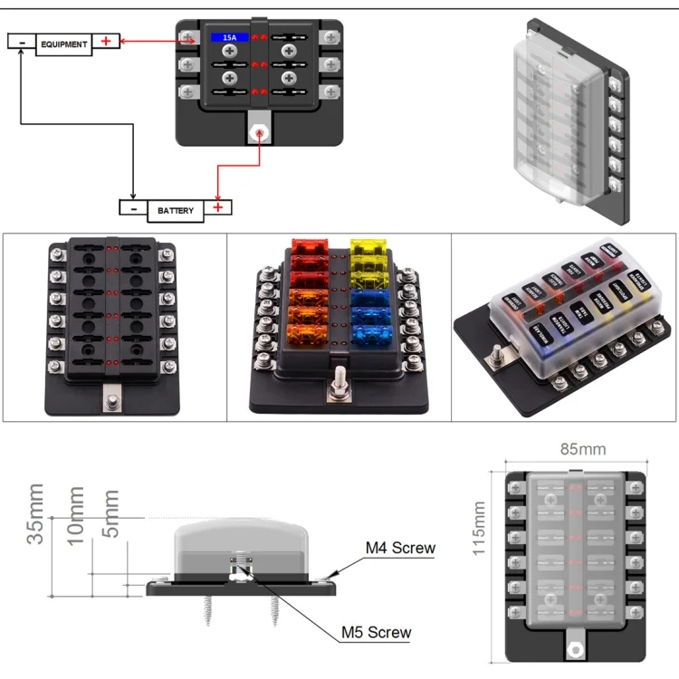 1 in 12 Out Fuse Box Screw Terminal Section Fuse Holder Kits with LED Warning Indicator for Auto Car Truck Boat