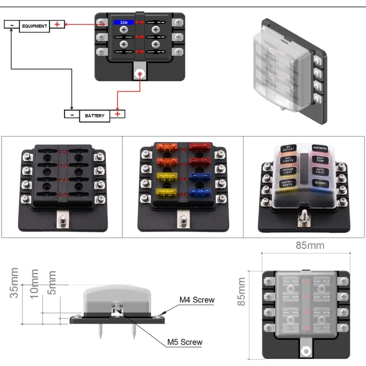 1 in 8 Out Fuse Box Screw Terminal Section Fuse Holder Kits with LED Warning Indicator for Auto Car Truck Boat