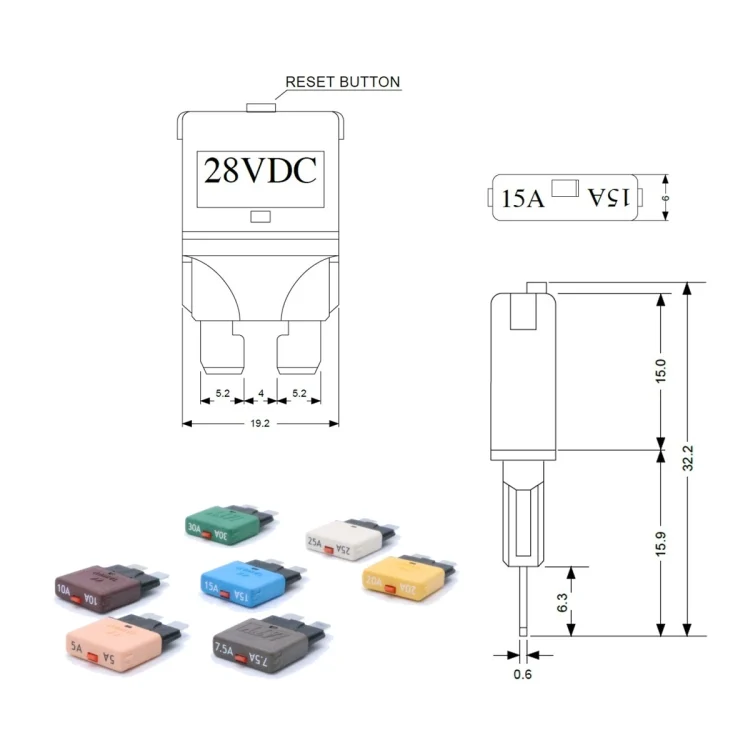 1. Miniaturized single pole press-to-reset thermal circuit breaker designed. For automotive fuse block installation.Extends the benefits of circuit breaker performance and Convenience to application.
