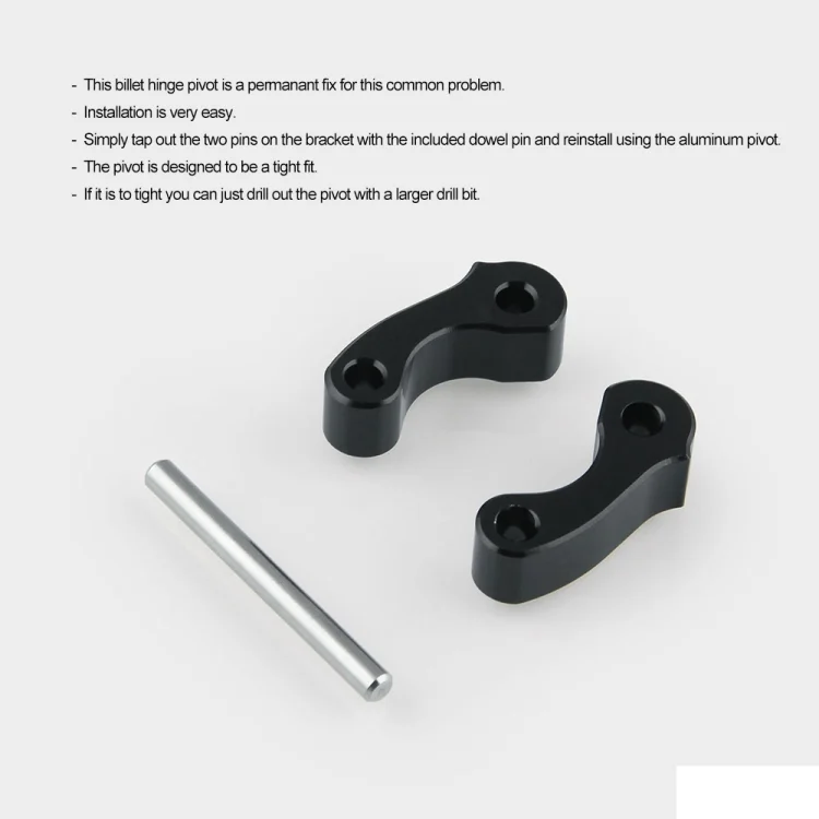 4. Installation is very simple. Gently tap the two pins on the bracket using the included locating pins and reinstall using the aluminum hinge pivot