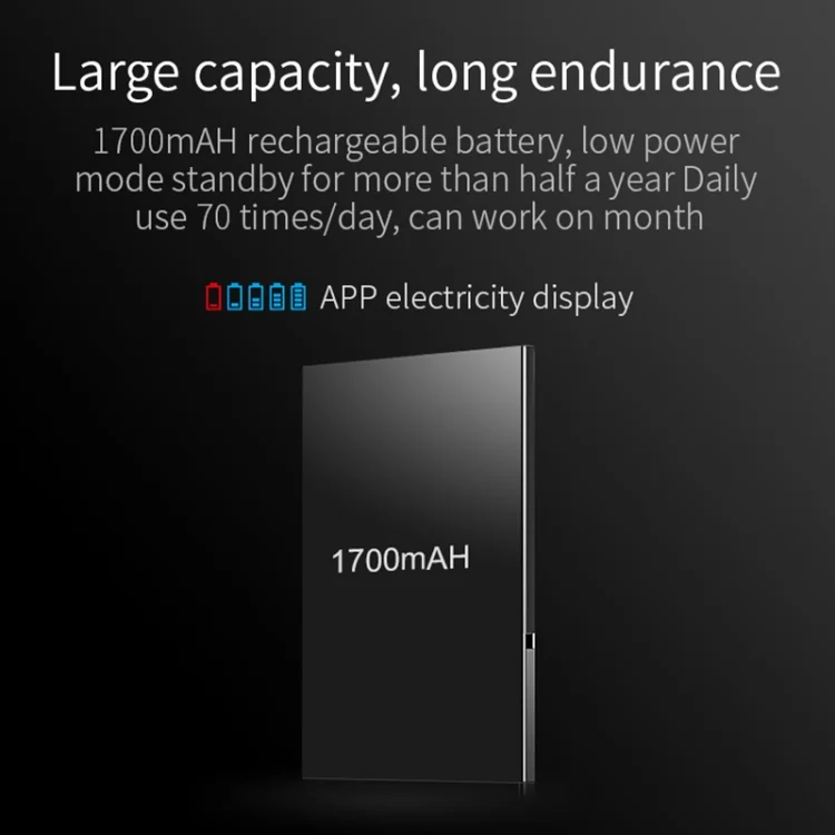 4. 1700mAH rechargeable battery, low power mode standby for more than half a year. Daily use 70 times / day, can work on month.