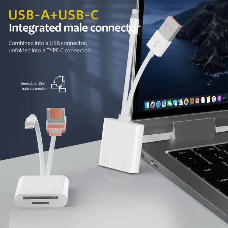Type-C/8 Pin/USB-A 3-in-1 card reader is an accessory specially developed for the problem of importing photos from digital cameras into devices, which is too cumbersome. By using the TF/SD card slot of the adapter, the digital cameras storage card can be directly imported into the device with a converter