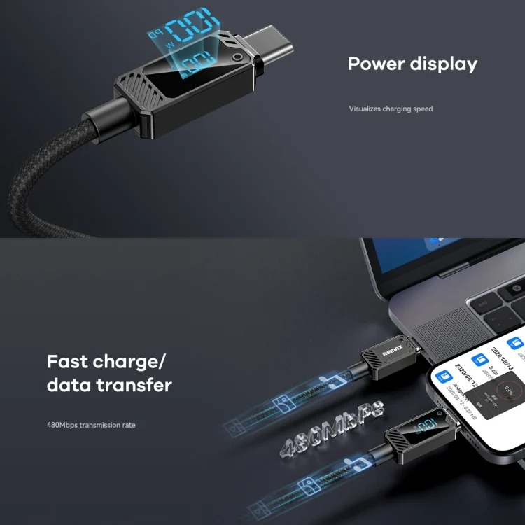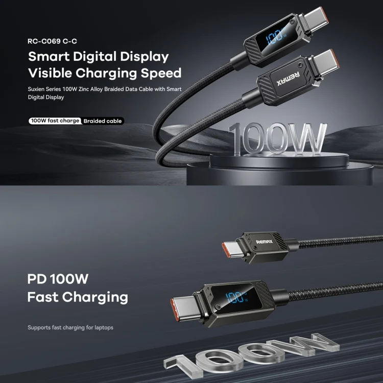 REMAX RC-C069 1.2m 100W Type-C to Type-C Digital Display Braided Fast Charging Cable, RC-C069