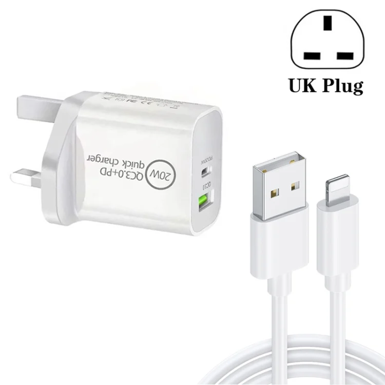 SDC-20WA+C 20W PD 3.0 + QC 3.0 USB Dual Fast Charging Universal Travel Charger with USB to 8 Pin Fast Charging Data Cable, UK Plug