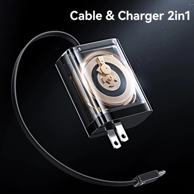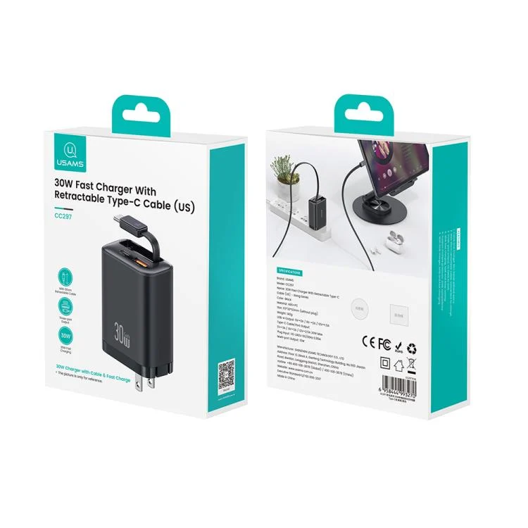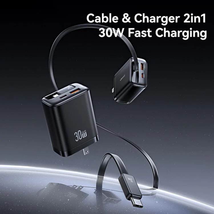 USAMS CC297 30W Fast Charger With Retractable USB-C / Type-C Cable, US Plug