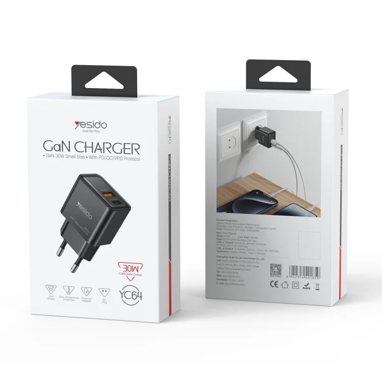 Yesido YC64 PD 30W USB-C/Type-C+USB Interface GaN Fast Charging Charger, YC64