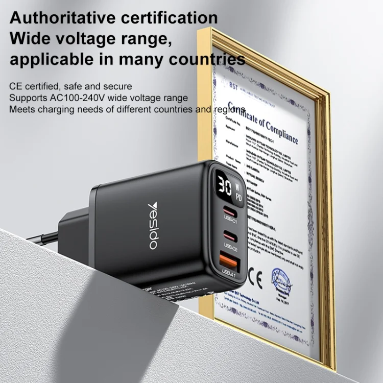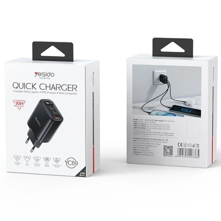 Yesido YC69 30W USB + Dual USB-C / Type-C Digital Display Charger, Specification:EU Plug, YC69