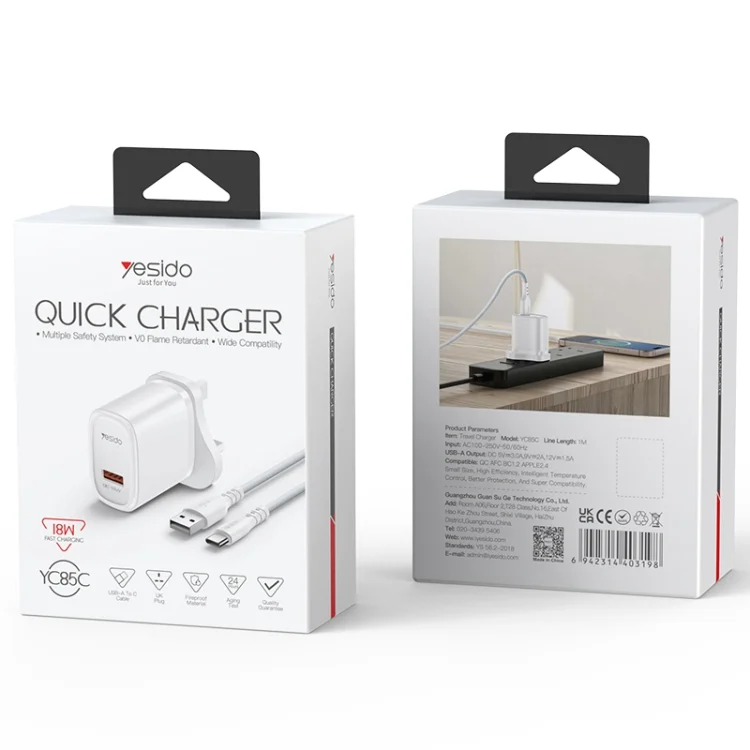 Yesido YC85C 18W USB Fast Charger with USB to USB-C / Type-C Cable, YC85C