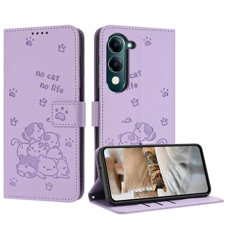 Embossed Kitten Phone Leather Case with Lanyard, For vivo Y29s 5G / Y04 4G, For vivo Y29 4G, For vivo V50 5G Global