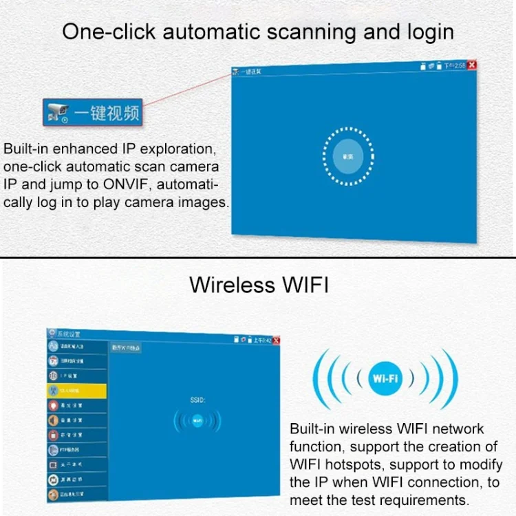 3. The upgraded version of extremely fast ONVIF supports lens simulation, lens focus test, test report generation, audio test and more functions.