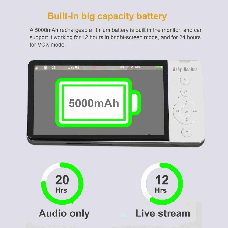 1. The sounds and images of the baby are transmitted to the display in real time. Adults can monitor the babys condition in real time. When the intercom button on the display is pressed, they can send language to the baby.