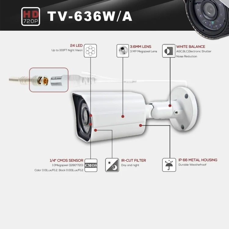 636A CE & RoHS Certificated Waterproof 3.6mm 3MP Lens AHD Camera with 24 IR LED, Support Night Vision & White Balance