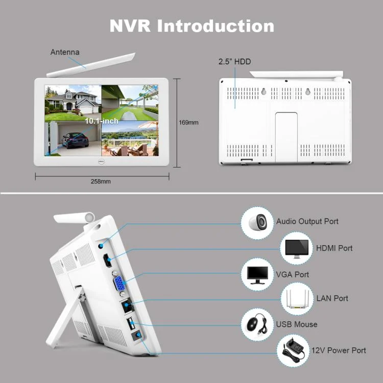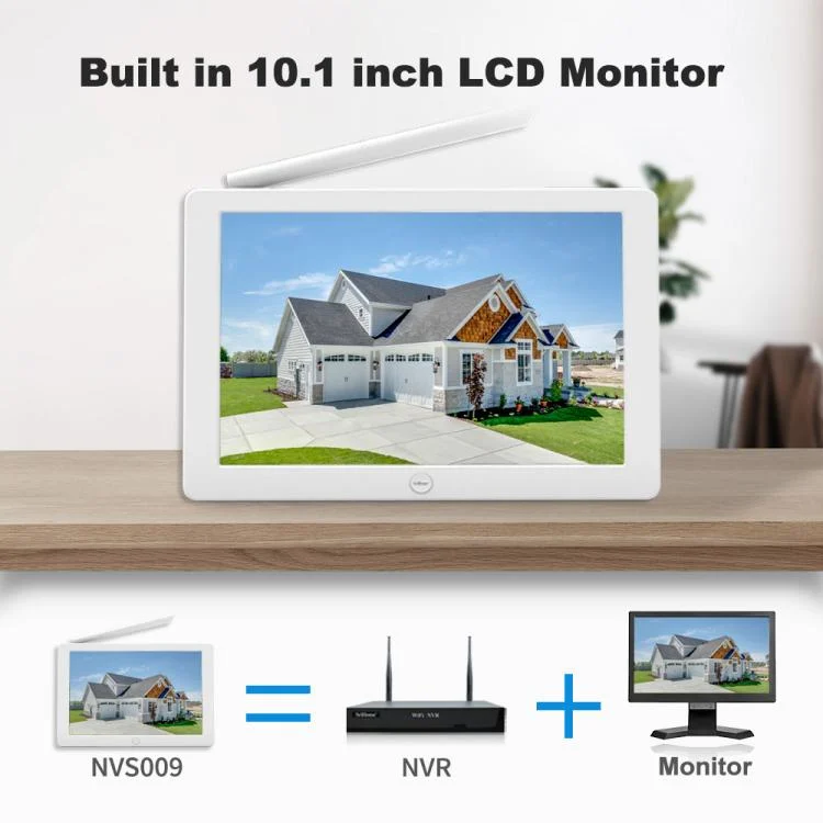 1. 1080P 4-channel wireless NVR kit with a built-in 10.1-inch LCD screen.