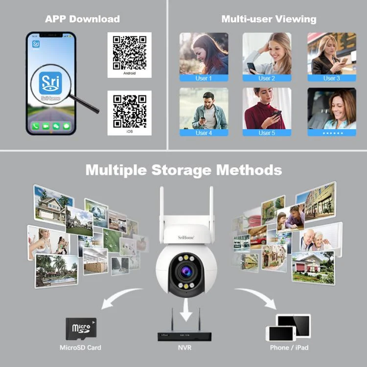 13. App: Supports iOS, Android (SriHome app), and VMS