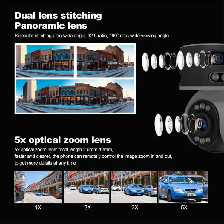 Viewing angle: zoom lens: horizontal 30-110 degrees, vertical 58 degrees; stitching lens: horizontal 170 degrees, vertical 50 degrees