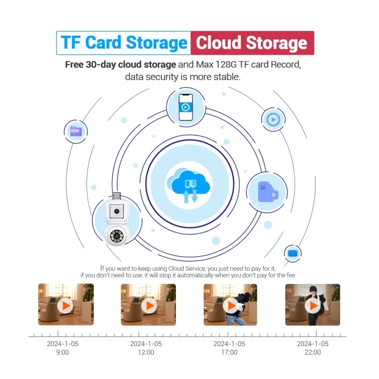 6. Support max up to 128G TF card and cloud storage(Free 30-day cloud storage).