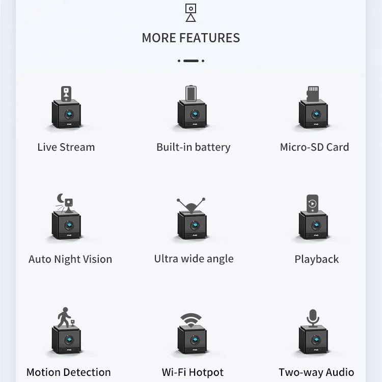 1. Mini Compact security camera, support two way audio, pet camera, baby monitor and siren alarm motion detection, which can be mount anywhere.