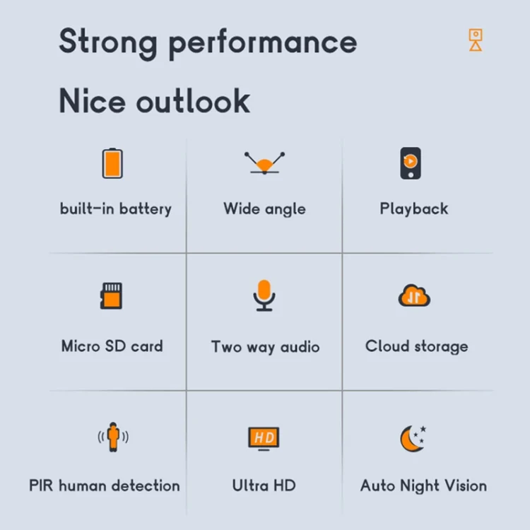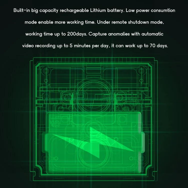 1. Ultra-low power consumption chip, fast wake-up function. When human body infrared is triggered, the camera quickly starts recording and completes video upload, and then quickly enters low-power sleep mode.