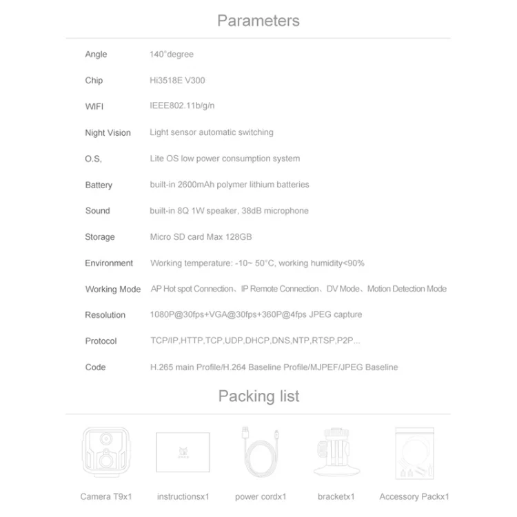 Working mode: AP hotspot direct connection, IP remote access, DV direct recording mode, motion detection alarm Storage power supply: 2600mAh pure cobalt polymer lithium battery