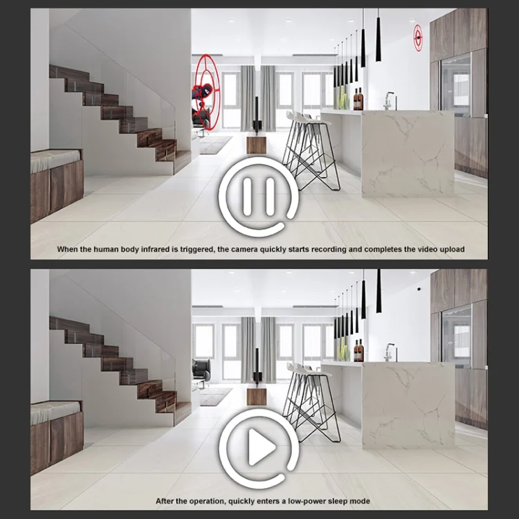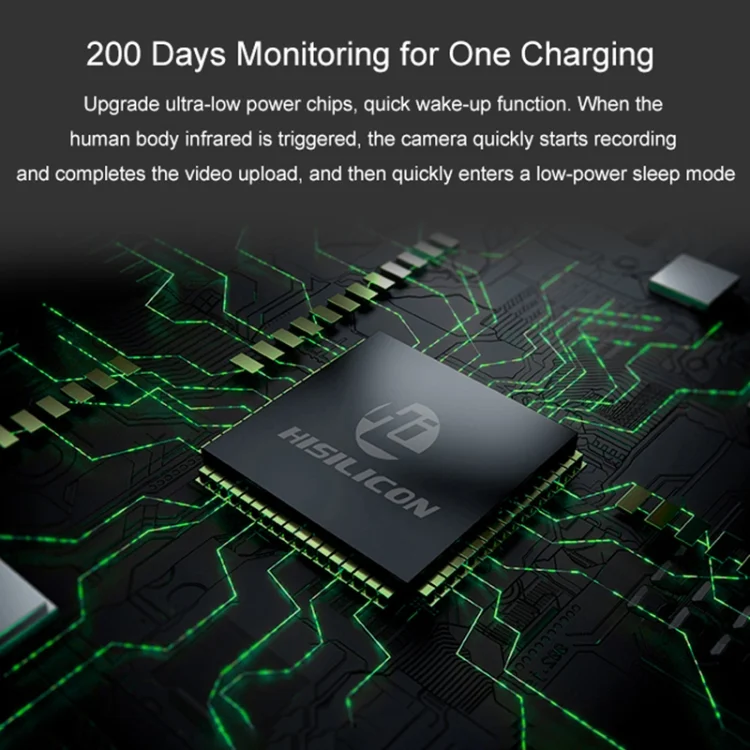 1. Ultra-low power consumption chip, fast wake-up function. When human body infrared is triggered, the camera quickly starts recording and completes video upload, and then quickly enters low-power sleep mode.