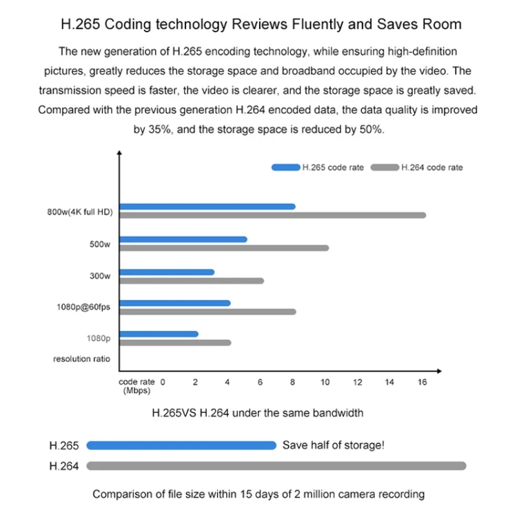 3. H.265 encoding technology, smooth viewing and space saving: H.265 video encoding technology, while ensuring high-definition images, greatly reduces the storage space and bandwidth occupied by the video.