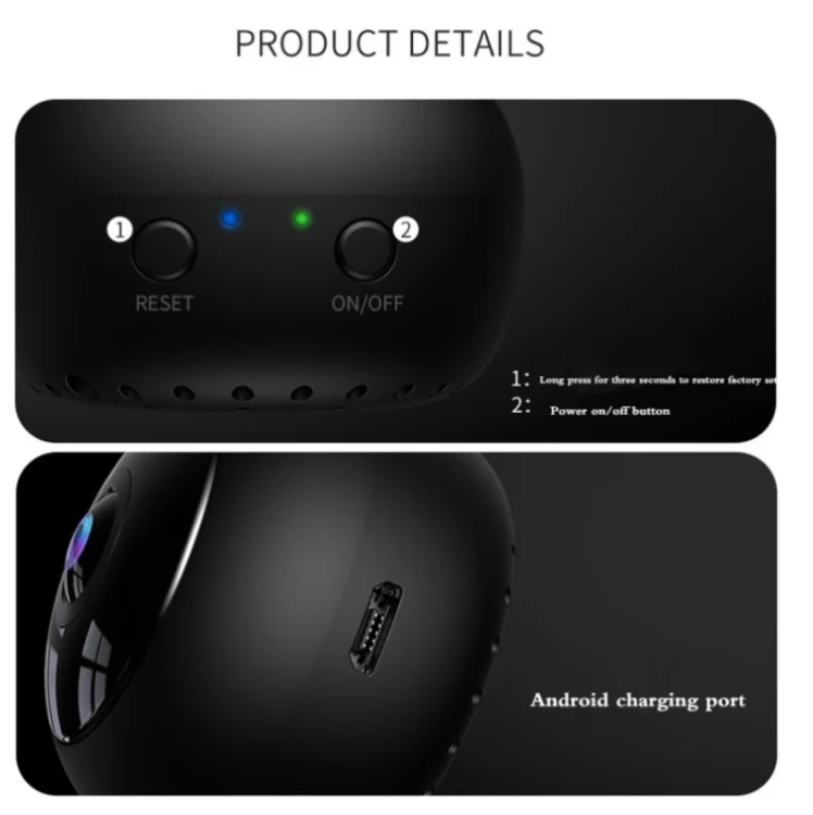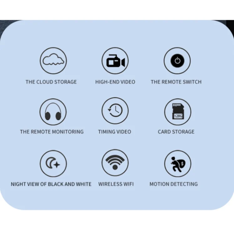 1. Functions: Video, audio, motion detection, remote alarm, loop video, WIFI, P2P remote monitoring, high-definition infrared night vision, built-in magnet adsorption.
