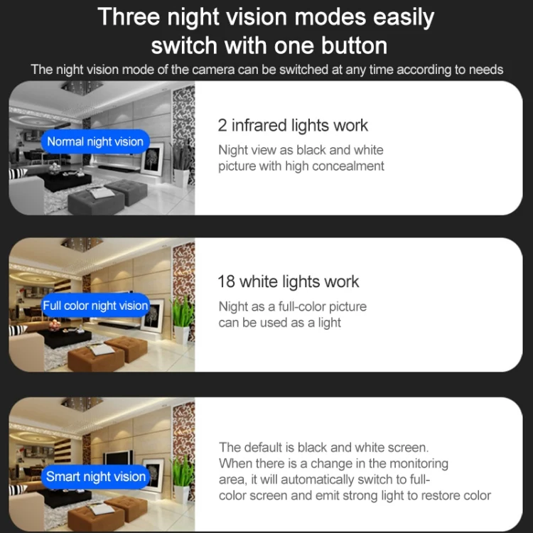 1. There are three modes of ordinary night vision / full color night vision / smart night vision, with one key switch.
