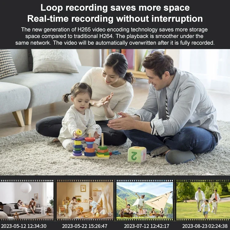 5. Loop recording saves more space, real-time recording is uninterrupted: H265 video encoding technology, smoother viewing and playback, automatic overwriting after full recording