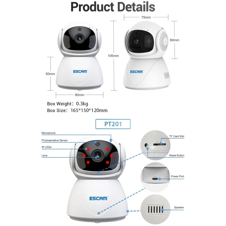 ESCAM PT201 HD 1080P Dual-band WiFi IP Camera, Support Night Vision / Motion Detection / Auto Tracking / TF Card / Two-way Audio, EU Plug
