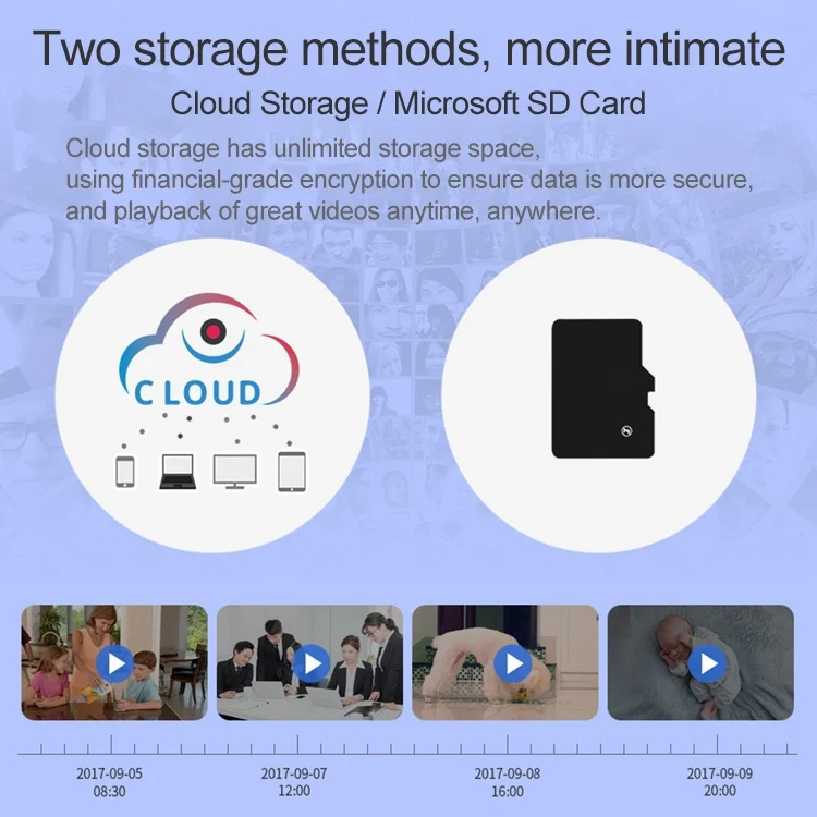 Cloud storage and Microsoft SD card, cloud storage has wireless storage space, financial level encryption to ensure data security, playback of exciting video anytime, anywhere