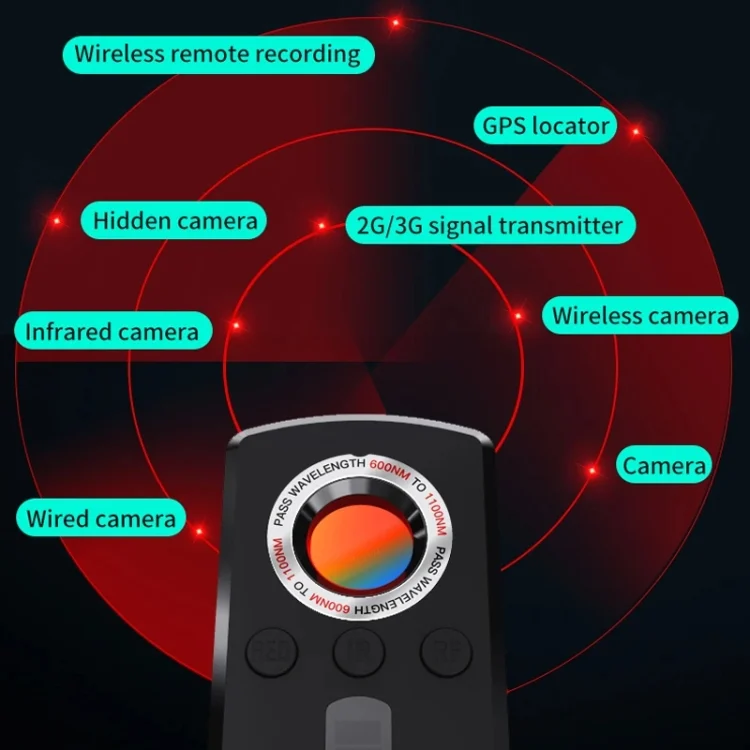 10. Can detect wired cameras, wireless cameras, infrared cameras, remote recorders with sim cards, GPS locators with sim cards, 2G/3G signal transmitters, 2.4Gwifi signal transmitters and other products with RF radiation