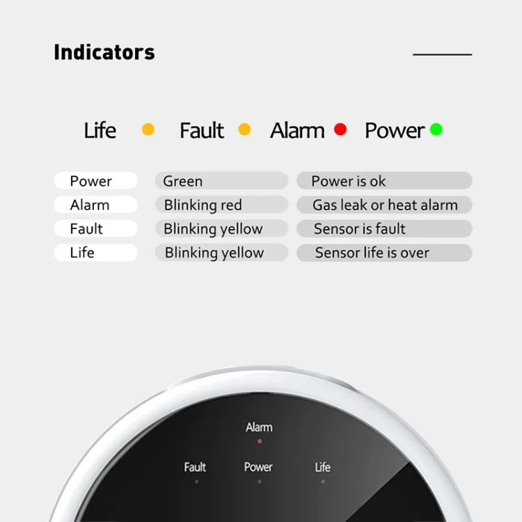 6. Multi-state display: Displays a yellow light when the device fails or the service life is low. When the gas concentration or temperature reaches a certain height, it displays a red light, and other states display a green light.