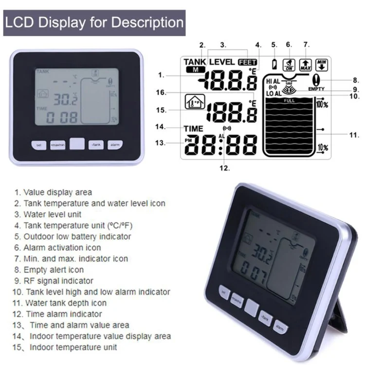 TS-FT002 Multifunctional Ultrasonic Electronic Water Tank Level Gauge With Indoor Temperature Thermometer Clock Display Water Level Gauge