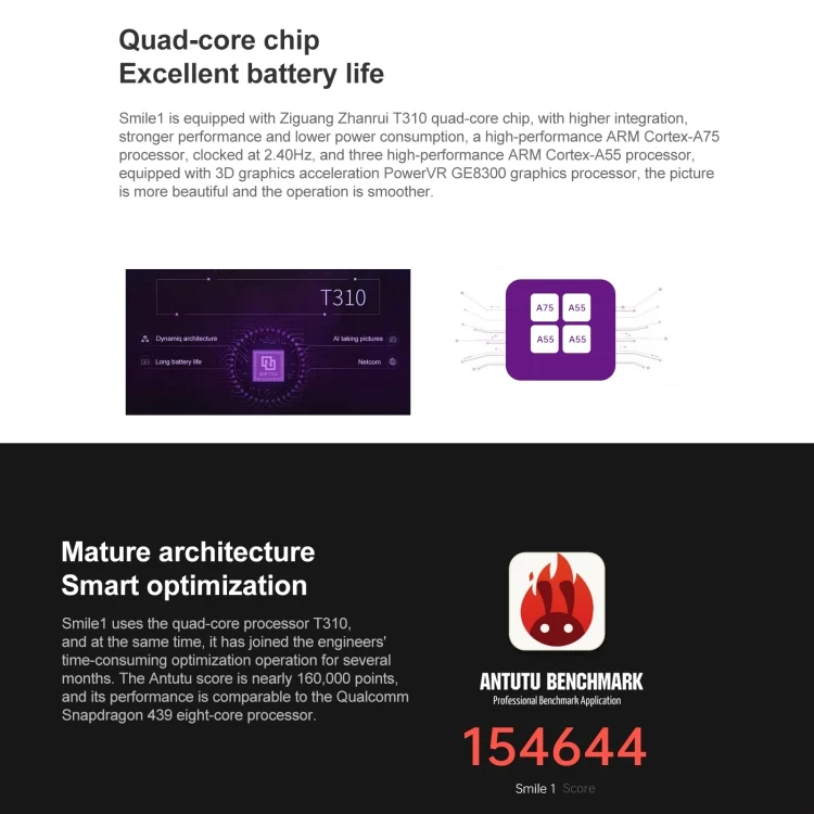 2. CPU: Unisoc T310 Quad core (1 x A75 2.0G + 3 x A55 1.8GHz)
