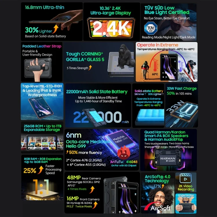 Blackview Active 8 Pro 4G Rugged Tablet, 10.36 inch 8GB+256GB Android 14 MT6789 Octa Core Support Dual SIM, Global Version with Google Play, EU Plug